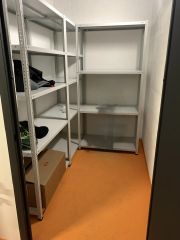 Расположена в том же подъезде, что и квартира. Оборудована металлическими стеллажами. Примыкает с одной стороны к бетонной-монолитной стене, при желании можно увеличить объем кладовки, надстроить вверх стены пеноблоком (см. фото).