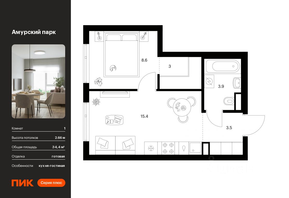 Продаётся 1-комн. квартира площадью 34,4 кв.м на 15 этаже 27 этажного дома (Корпус 4.5, Секция 6) проекта ПИК Амурский парк. Светлый просторный подъезд на уровне земли, функциональная планировка, большие окна, c отделкой.