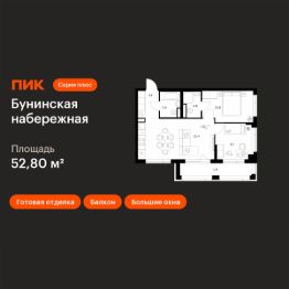 Продаётся 2-комн. квартира площадью 52,8 кв.м на 9 этаже 16 этажного дома (Корпус 2.6/1.4, Секция 4) проекта ПИК Бунинская набережная. Светлый просторный подъезд на уровне земли, функциональная планировка, большие окна, c отделкой.