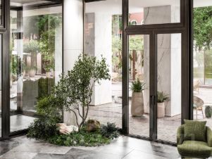 Для жителей создан изящный зелёный двор-сад со своей оранжереей, пространствами для спокойного и активного отдыха, включая детскую площадку по стандарту Kids Lab. Акцентное мощение двора перетекает в интерьеры приватного лобби с дорогой отделкой.