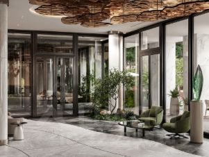 Для жителей создан изящный зелёный двор-сад со своей оранжереей, пространствами для спокойного и активного отдыха, включая детскую площадку по стандарту Kids Lab. Акцентное мощение двора перетекает в интерьеры приватного лобби с дорогой отделкой.