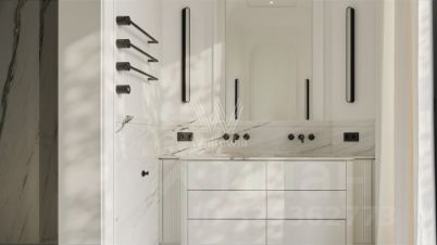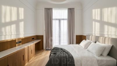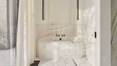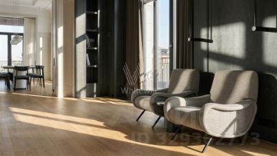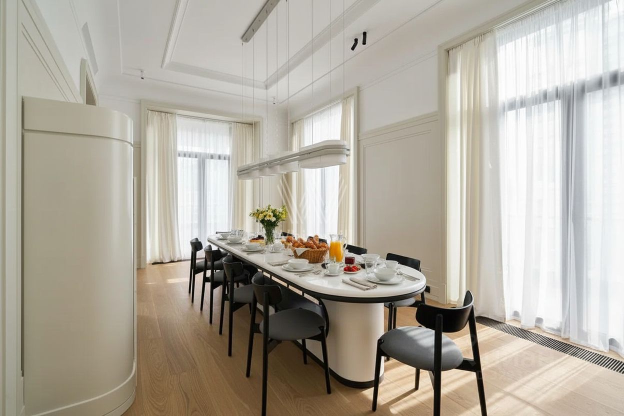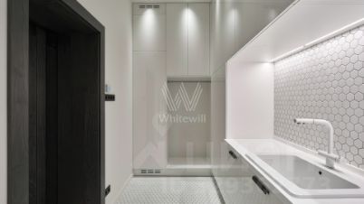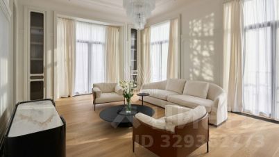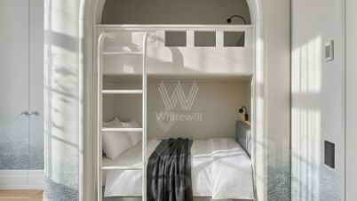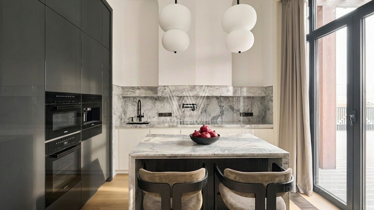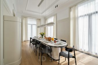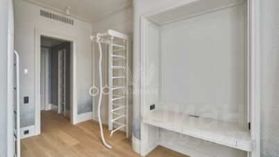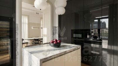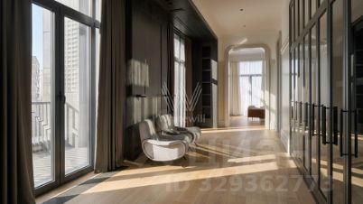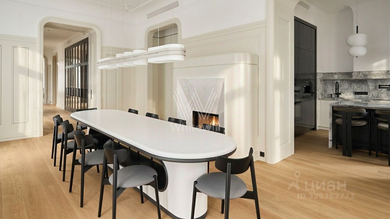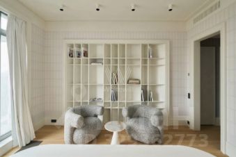 Спланирована светлая угловая гостиная с тремя окнами, уютная обеденная зона с камином, просторный зал-библиотека с выходом на террасу, кухня с островом. В приватной части организован блок из трёх спален и кабинета. Обустроена мастер-спальня со своей гардеробной и ванной комнатой с выходом на террасу, детская спальня со своим санузлом, санузел в холле. При входе в квартиру расположен гостевой санузел и постирочная. В стоимость включены два машино-места и кладовая.