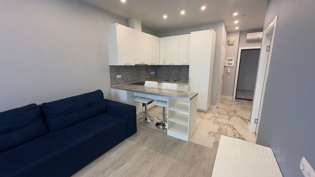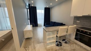 Интерьер выполнен в спокойной современной гамме. Большие окна дают хорошее естественное освещение и визуально расширяют пространство. Апартамент полностью готов к проживанию — мебель и техника уже установлены, дополнительных вложений не требуется.