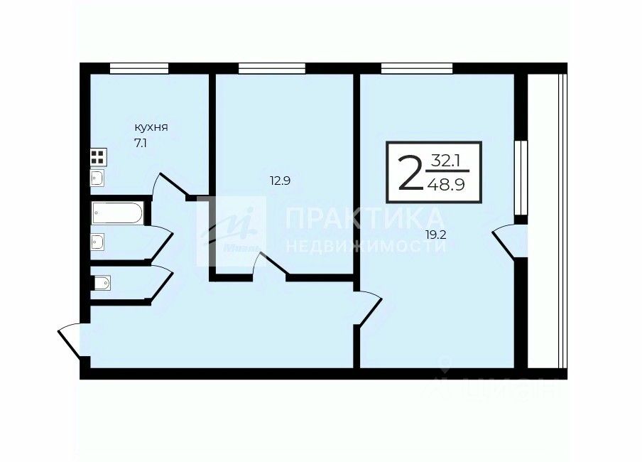 Общая площадь квартиры составляет 48,9 кв. м, из которых 32,1 кв. м — жилая площадь:
