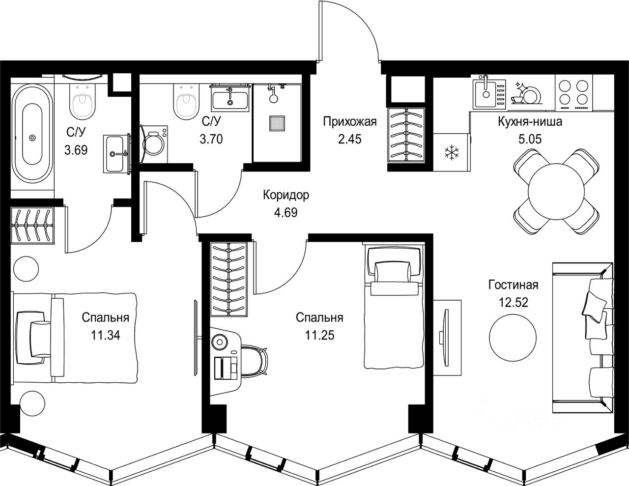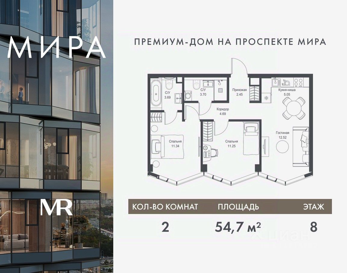 Продаётся 2-комнатная квартира общей площадью 54.69 м² без отделки в доме премиум-класса МИРА на 8-м этаже 24 этажного дома. Квартира расположена в корпусе 3.