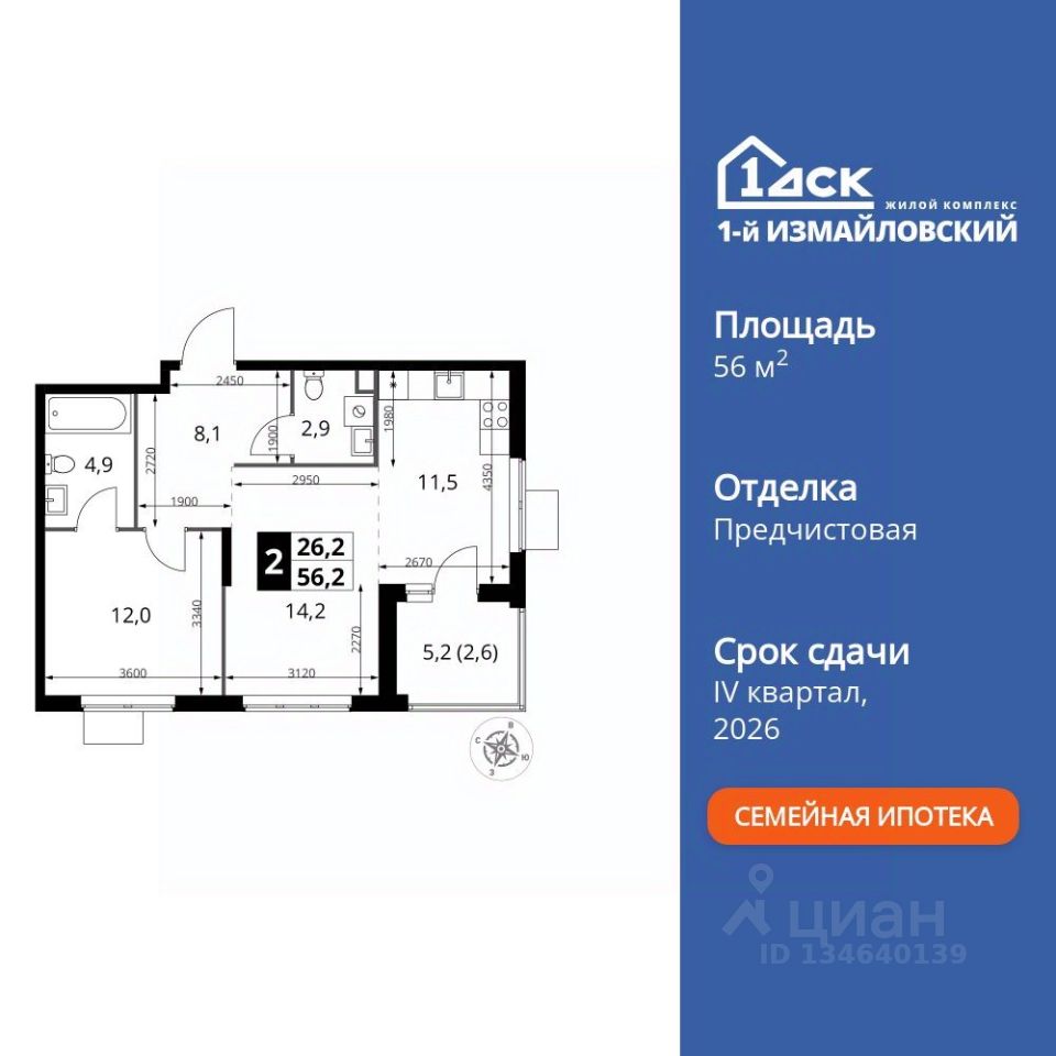 Продаётся 2-к квартира номер 484 общей площадью 56.2 кв.м. на 17-м этаже 23 этажного здания. Предчистовая отделка. Цена с учётом скидки.