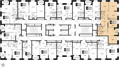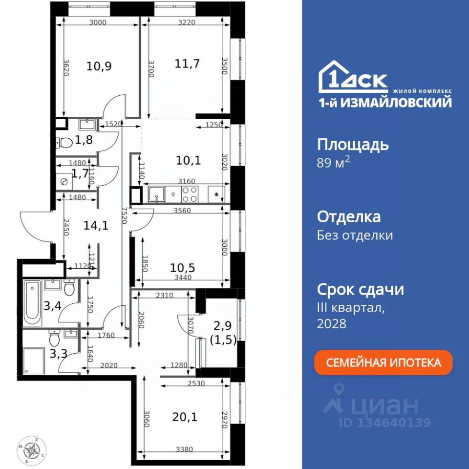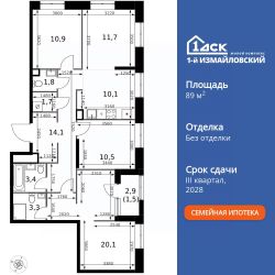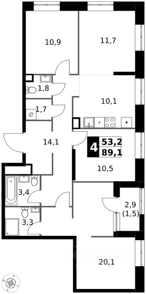 Продаётся 4-к квартира номер 747 общей площадью 89.1 кв.м. на 23-м этаже 32 этажного здания. Без отделки.
