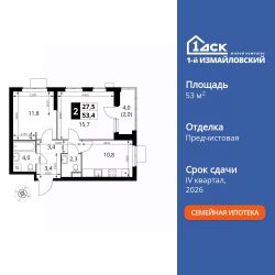 Продаётся 2-к квартира номер 92 общей площадью 53.4 кв.м. на 9-м этаже 25 этажного здания. Предчистовая отделка. Цена с учётом скидки.