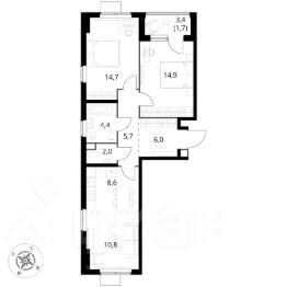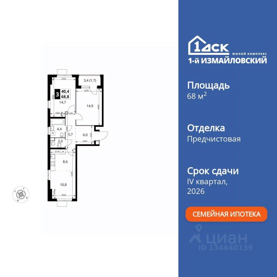 Продаётся 3-к квартира номер 298 общей площадью 68.8 кв.м. на 3-м этаже 12 этажного здания. Предчистовая отделка. Цена с учётом скидки.