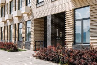 Входные группы с панорамным остеклением расположены на уровне земли: можно без усилий спуститься с коляской или велосипедом. Над дизайном лобби и подъездов работала мастерская "Балкон".