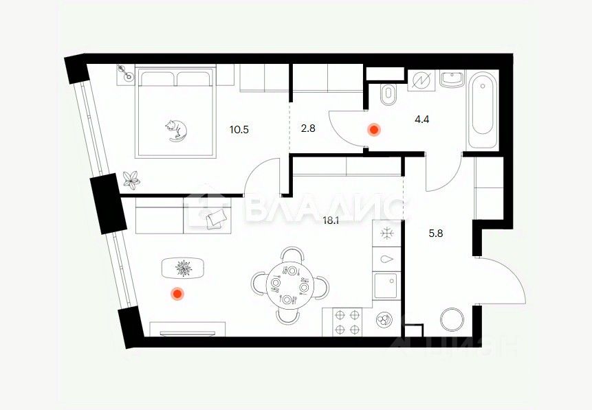 • Планировка: кухнягостиная + спальня.
