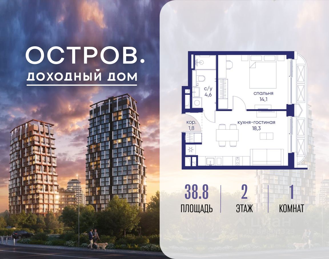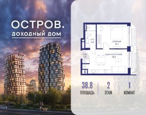 Продаётся 1-комн. квартира от застройщика: общая площадь 38.80 м², жилая 14.10 м², кухня 18.30 м², 2-й этаж, жилой квартал "Остров 14", корпус 1 (секция 2). Срок сдачи: 2 квартал 2029 года.