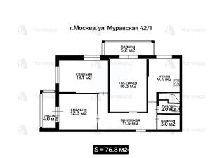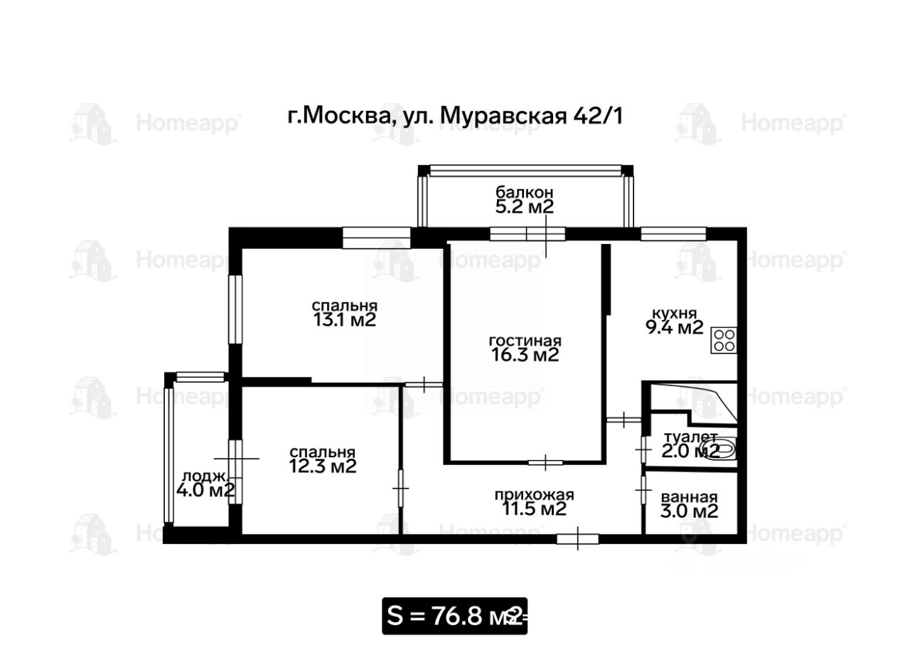 Общая площадь составляет 76,8 м² (с учётом балкона и лоджии), без учёта — 67,6 м². Жилая площадь — 41,7 м². Квартира расположена на 7 этаже 25-этажного дома, построенного в 2019 году.