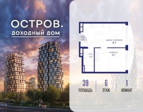 Продаётся 1-комн. квартира от застройщика: общая площадь 39.00 м², жилая 14.10 м², кухня 18.30 м², 6-й этаж, жилой квартал "Остров 14", корпус 1 (секция 1). Срок сдачи: 2 квартал 2029 года.