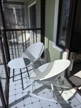 Балкон с остеклением в пол: Панорамное остекление наполняет комнату светом, а на самом балконе обустроена лаундж-зона с кофейным столиком и креслами-качалками. Окна зеркально затонированы.