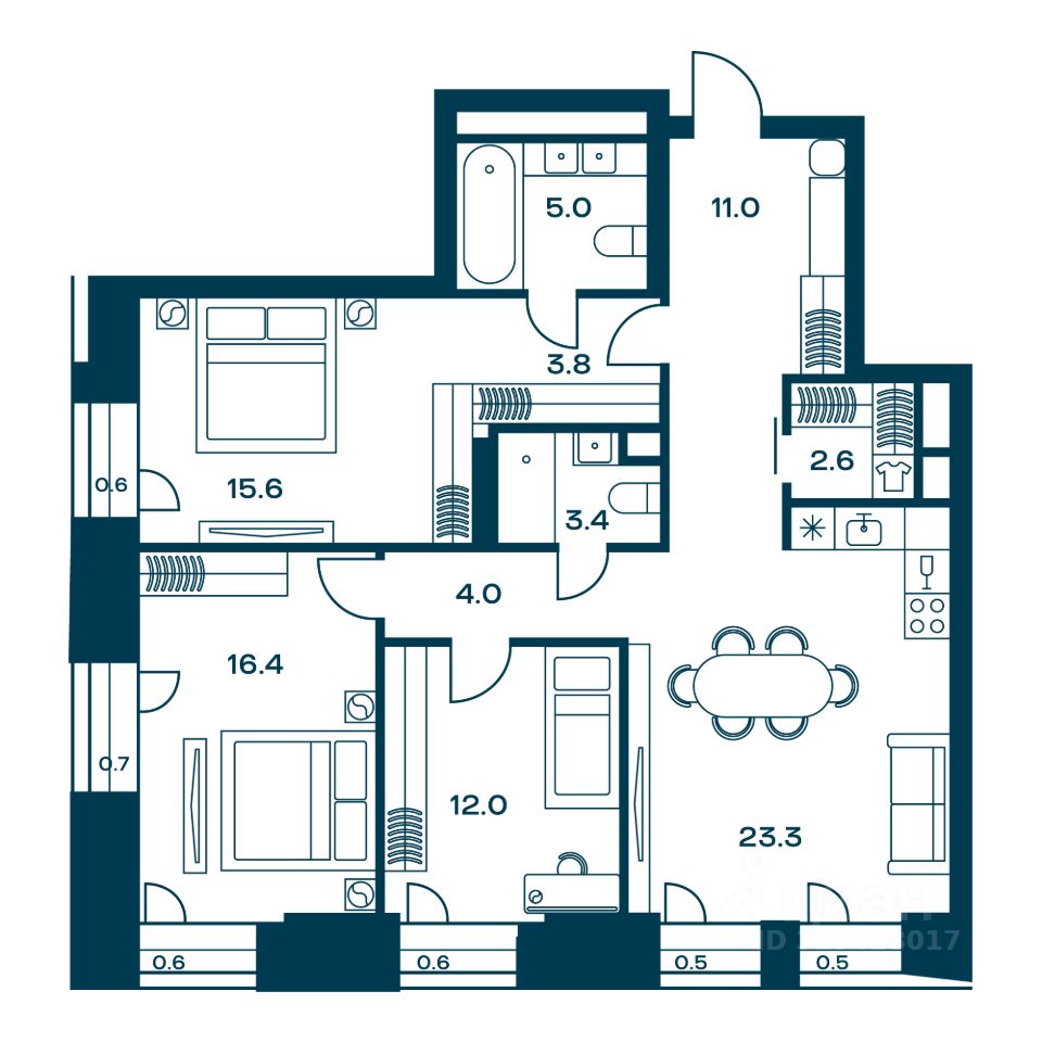 В квартире есть четыре лоджии, которые выходят во двор и обеспечивают тишину и уют. Два совмещенных санузла позволяют комфортно проживать всей семьей. Квартира с ПРЕДЧИСТОВОЙ ОТДЕЛКОЙ white box+ .