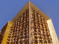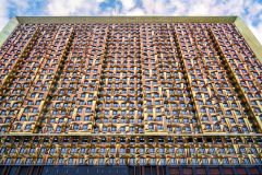 Здание состоит из двух объемов, один из которых сдвинут относительного другого в горизонтальной плоскости.