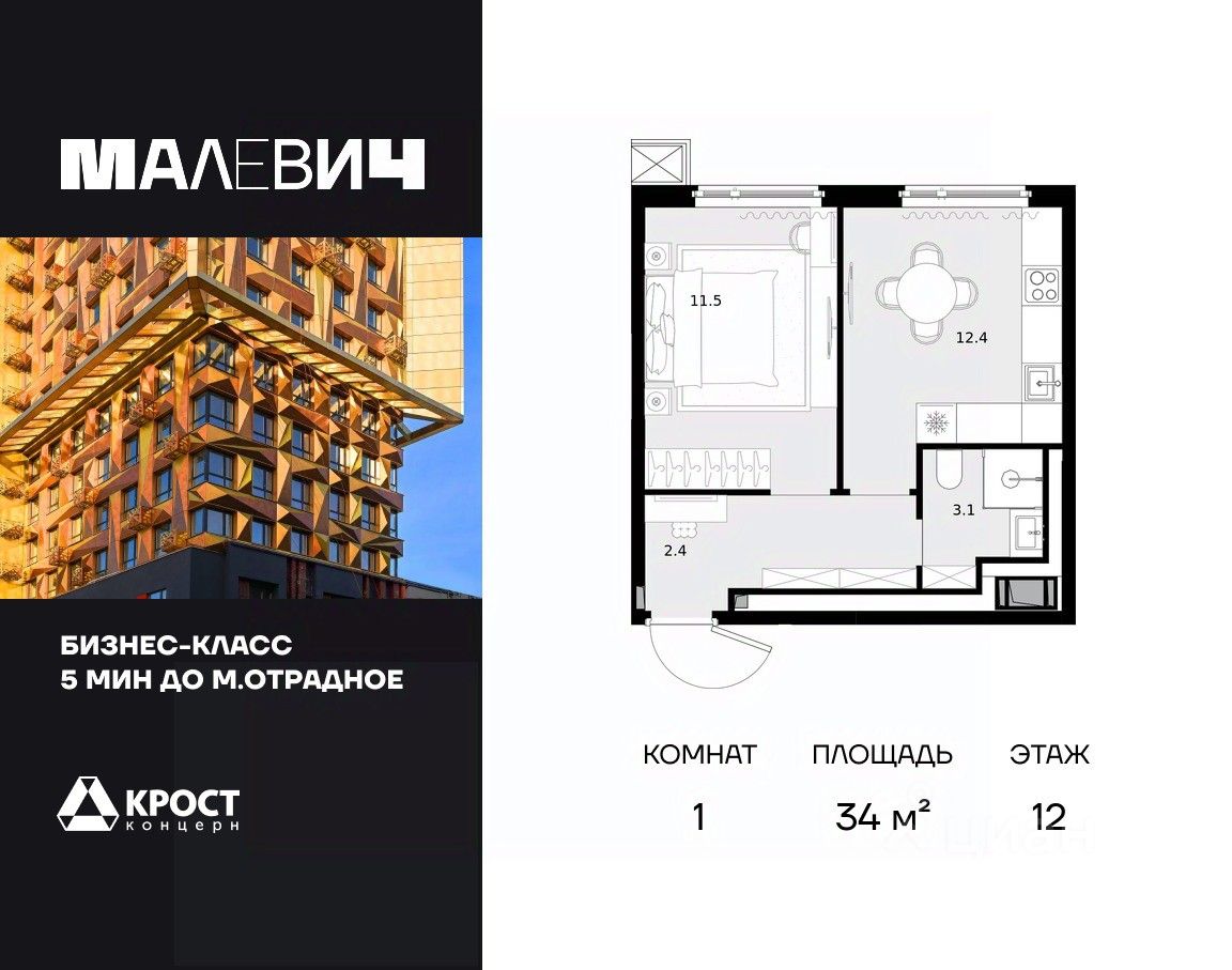 Продаётся 1-к квартира 34 кв.м. на 12-м этаже 28 этажного дома.