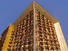 Здание состоит из двух объемов, один из которых сдвинут относительного другого в горизонтальной плоскости.