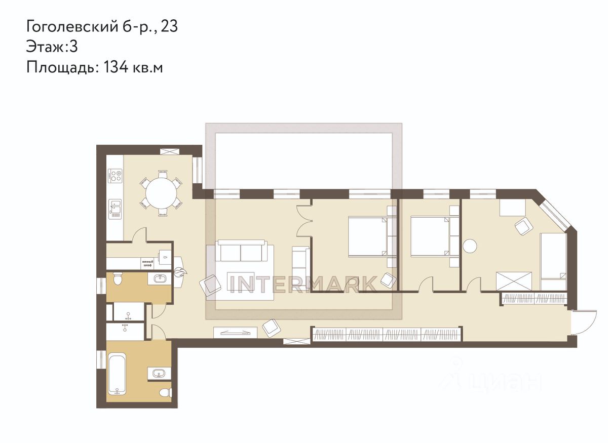 ID 65242: Просторная, невероятно светлая 4-комнатная квартира в фасадном доме на Гоголевском бульваре, выполненная в уютной классике.