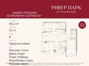 Продается 3-к квартира площадью 96.2 кв.м. на 8-м этаже в жилом комплексе премиум-класса Ривер Парк Кутузовский в Башне Изумруд