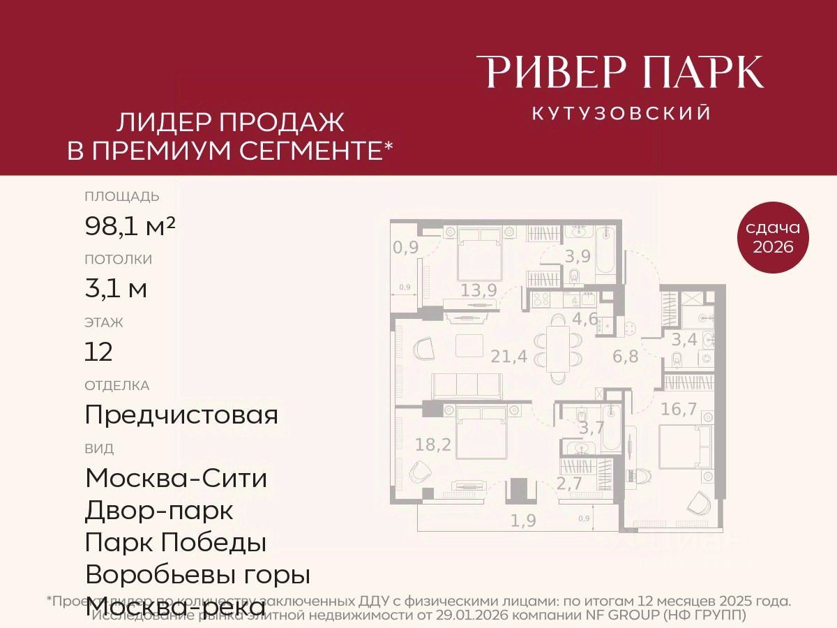 Продается 3-к квартира площадью 98.1 кв.м. на 12-м этаже в жилом комплексе премиум-класса Ривер Парк Кутузовский в Башне Изумруд