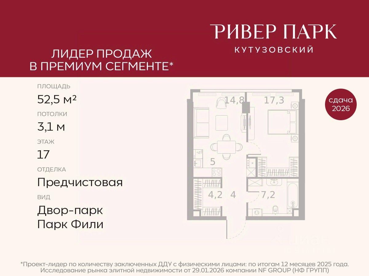 Продается 1-к квартира площадью 52.5 кв.м. на 17-м этаже в жилом комплексе премиум-класса Ривер Парк Кутузовский в Башне Изумруд