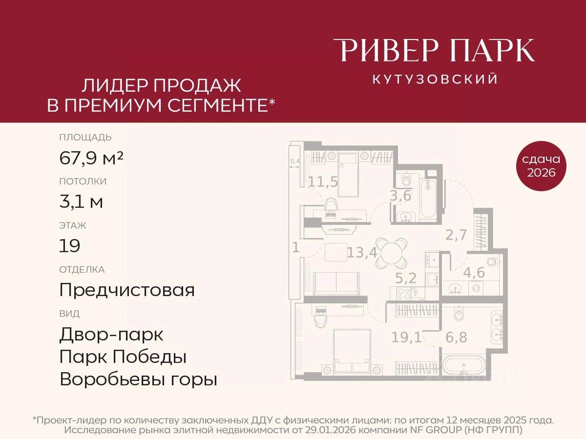 Продается 2-к квартира площадью 67.9 кв.м. на 19-м этаже в жилом комплексе премиум-класса Ривер Парк Кутузовский в Башне Изумруд