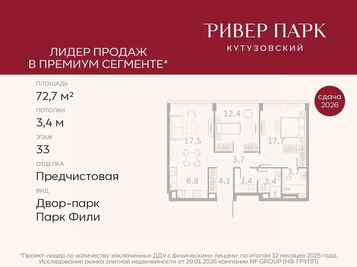 Продается 2-к квартира площадью 72.7 кв.м. на 33-м этаже в жилом комплексе премиум-класса Ривер Парк Кутузовский в Башне Изумруд