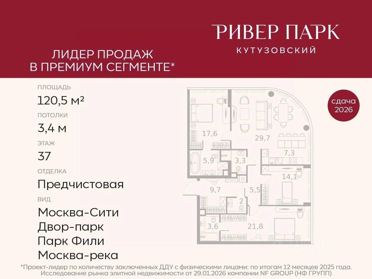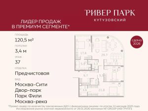 Продается 3-к квартира площадью 120.5 кв.м. на 37-м этаже в жилом комплексе премиум-класса Ривер Парк Кутузовский в Башне Изумруд