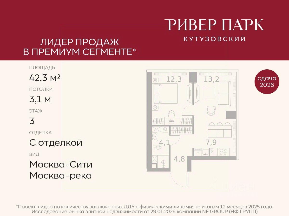 Продается 1-к квартира площадью 42.3 кв.м. на 3-м этаже в жилом комплексе премиум-класса Ривер Парк Кутузовский в Башне Топаз
