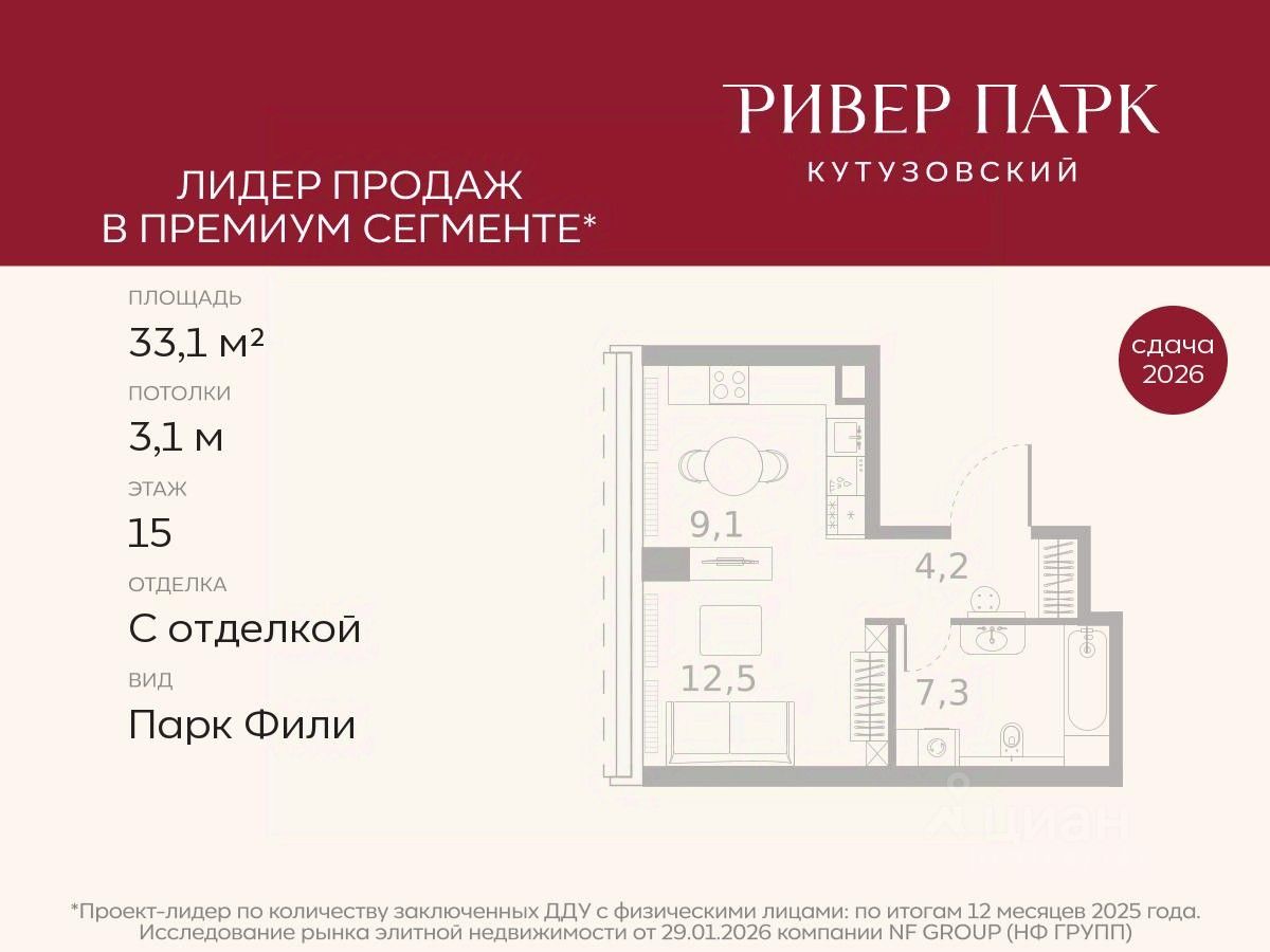 Продается студия площадью 33.1 кв.м. на 15-м этаже в жилом комплексе премиум-класса Ривер Парк Кутузовский в Башне Топаз