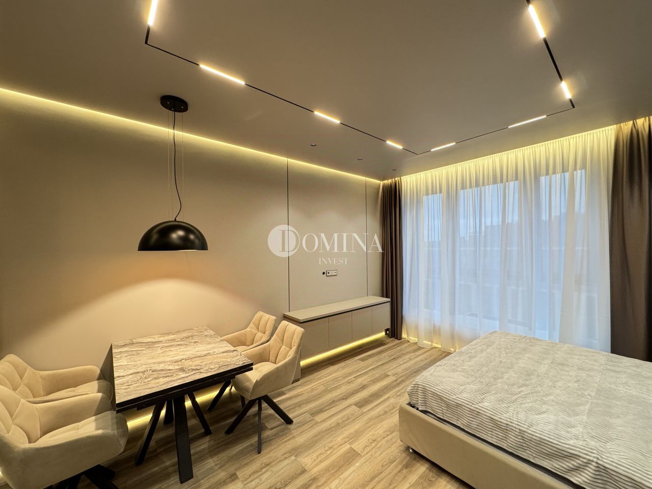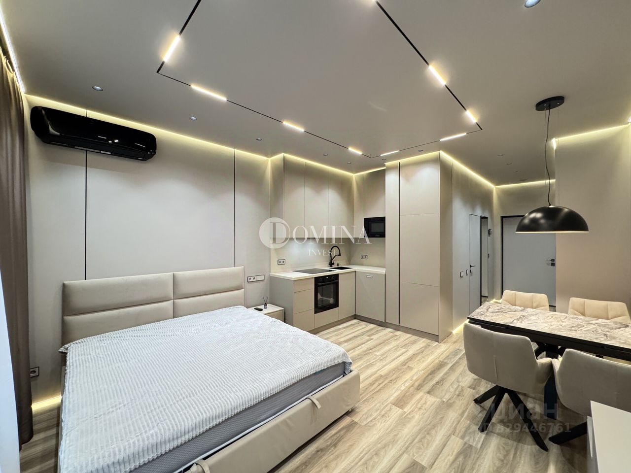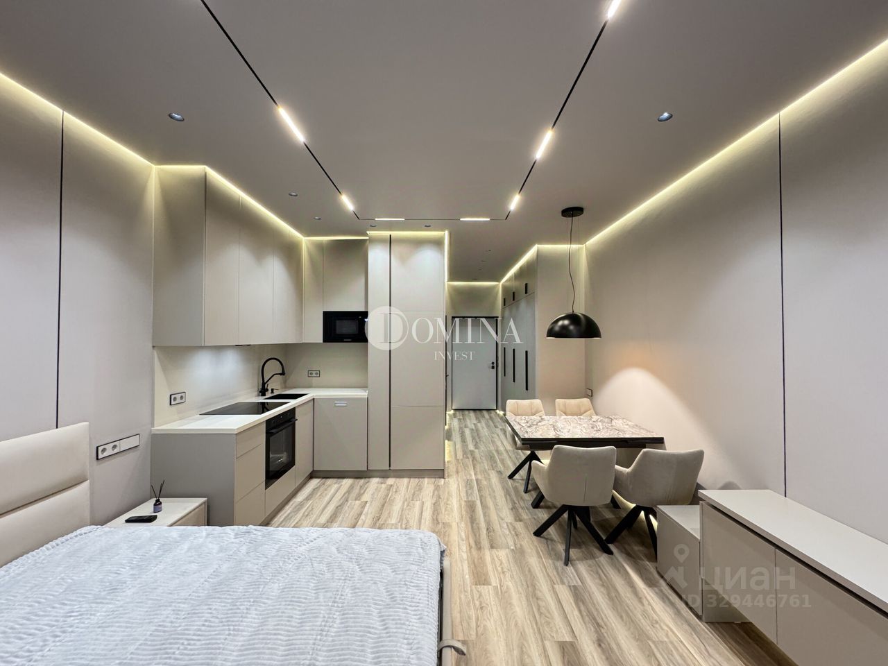Кварцвинил по всей квартире. Стены и потолки из ГКЛ под покраску, цвет тауп, краска моющаяся. Тёплый пол в прихожей. Встроенная мебель. Кровать Askona с местом хранения. Заказной раскладной стол и стулья. Шторы блэкаут, металлические карнизы. Итальянская люстра, регулируемое освещение, много сценариев света. Двери скрытого монтажа ProfilDoors, теневые профили.