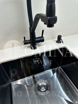 Столешница и фартук из искусственного камня. Кран под фильтр, возможность подключения измельчителя. Подсветка рабочей зоны, скрытая вытяжка в общую вентиляцию.