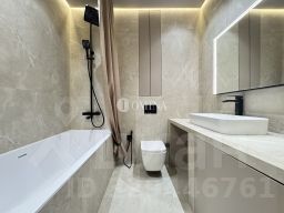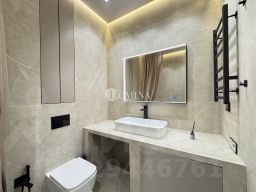 Инсталляция TECE, сантехника Raglo, итальянская ванна Salini. Гигиенический душ, розетка под умный унитаз. Встроенная стиральная машина. Тёплый пол, зеркало с подогревом и регулировкой света. Кафель Vitrum taupe, керамогранит Лапаррат. Скрытый монтаж карниза.