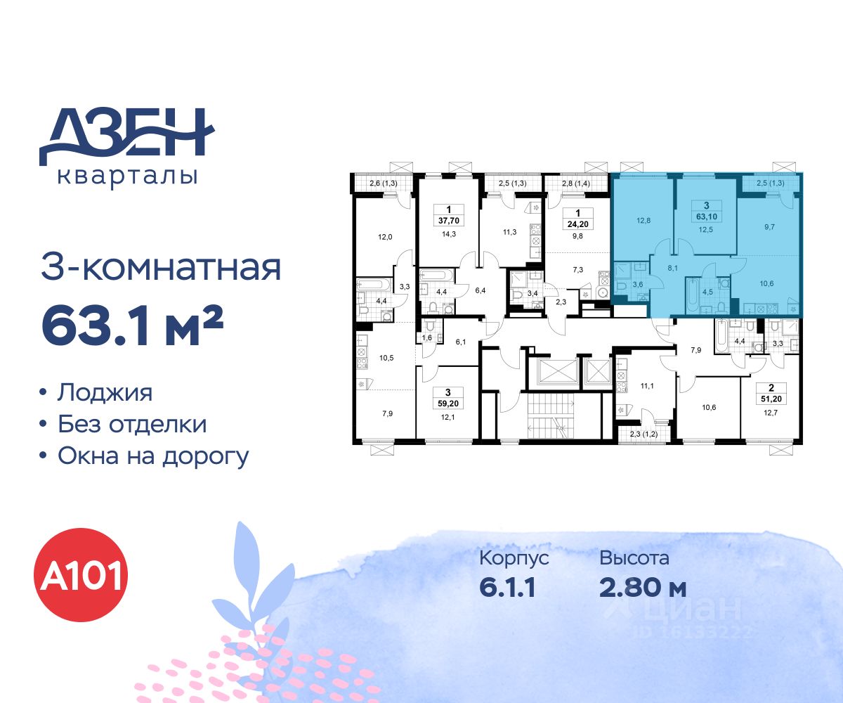 Продается трехкомнатная квартира 160 в новостройке ЖК "Дзен-кварталы" по адресу Москва, ТиНАО, Новомосковский АО, Сосенское С/П, жилой комплекс Дзен-кварталы, 6.1.1, район Коммунарка, Новомосковский административный округ, Москва. Общая площадь квартиры - 63.10 кв. м., этаж 6 из 11, секция 4. Тип проекта, по которому построен дом - монолит, компания-застройщик - ООО "А101". Стоимость квартиры - 23828453 Р. Срок сдачи - 2 квартал 2026.