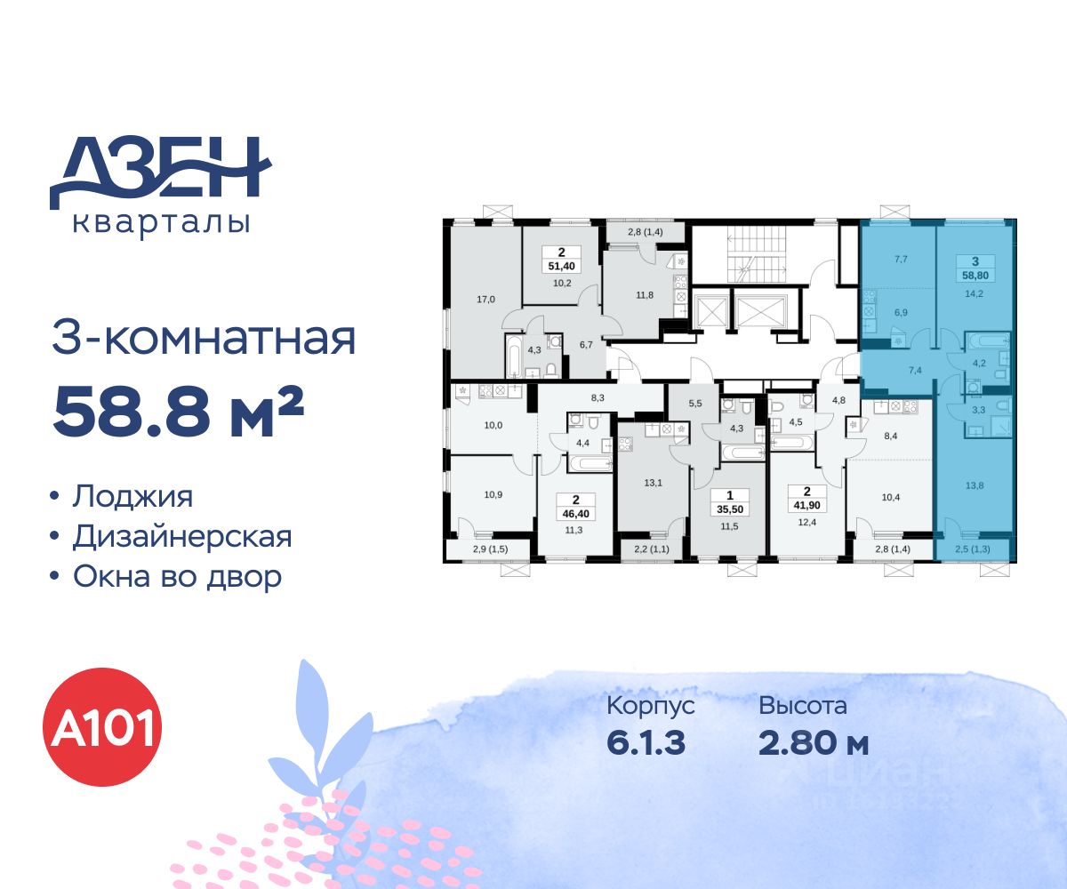 Продается трехкомнатная квартира 501 в новостройке ЖК "Дзен-кварталы" по адресу Москва, ТиНАО, Новомосковский АО, Сосенское С/П, жилой комплекс Дзен-кварталы, 6.1.3, район Коммунарка, Новомосковский административный округ, Москва. Общая площадь квартиры - 58.80 кв. м., этаж 14 из 14, секция 7. Тип проекта, по которому построен дом - монолит, компания-застройщик - ООО "А101". Стоимость квартиры - 31036404 Р. Срок сдачи - 3 квартал 2026.