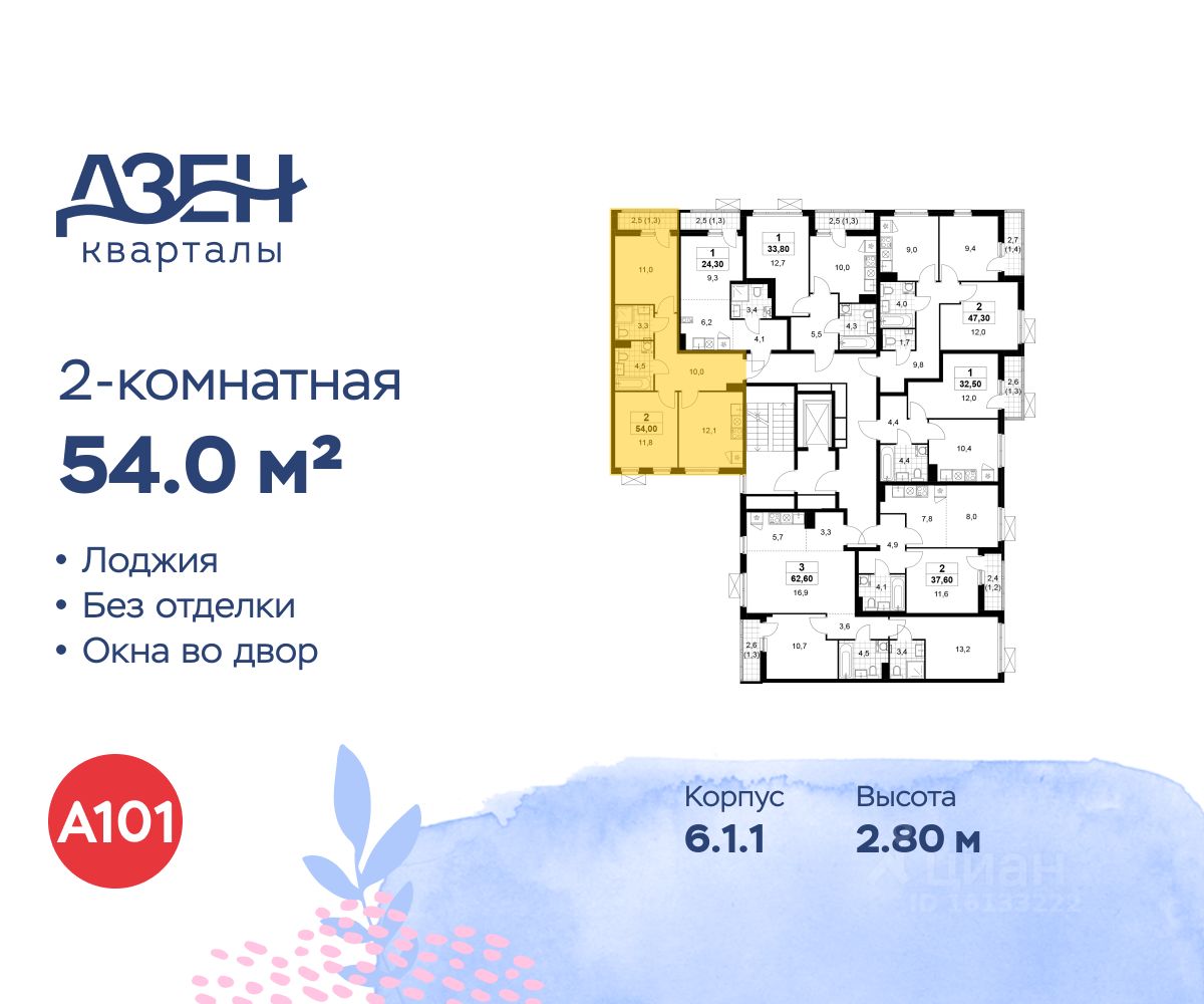 Продается двухкомнатная квартира 130 в новостройке ЖК "Дзен-кварталы" по адресу Москва, ТиНАО, Новомосковский АО, Сосенское С/П, жилой комплекс Дзен-кварталы, 6.1.1, район Коммунарка, Новомосковский административный округ, Москва. Общая площадь квартиры - 54.00 кв. м., этаж 9 из 9, секция 3. Тип проекта, по которому построен дом - монолит, компания-застройщик - ООО "А101". Стоимость квартиры - 23432760 Р. Срок сдачи - 2 квартал 2026.