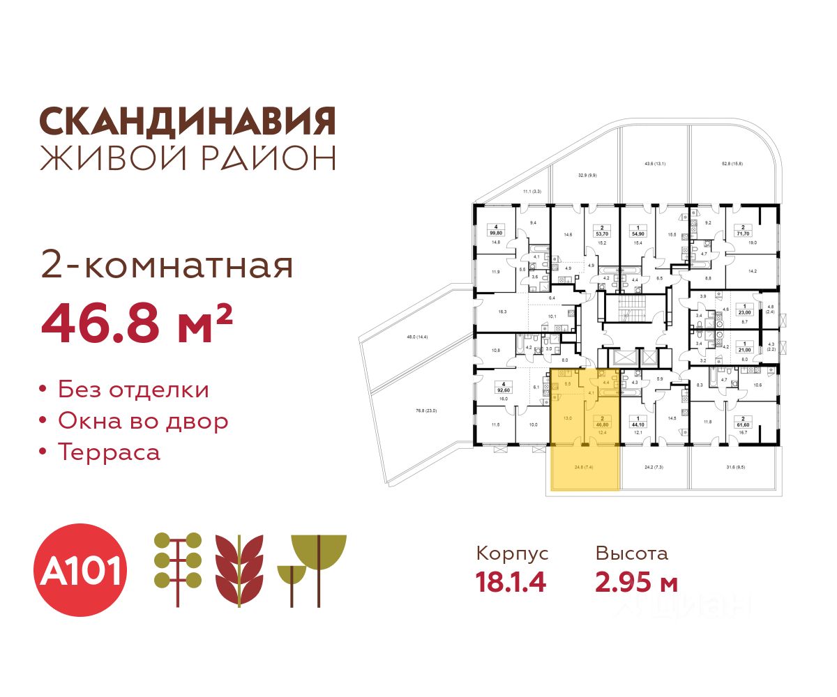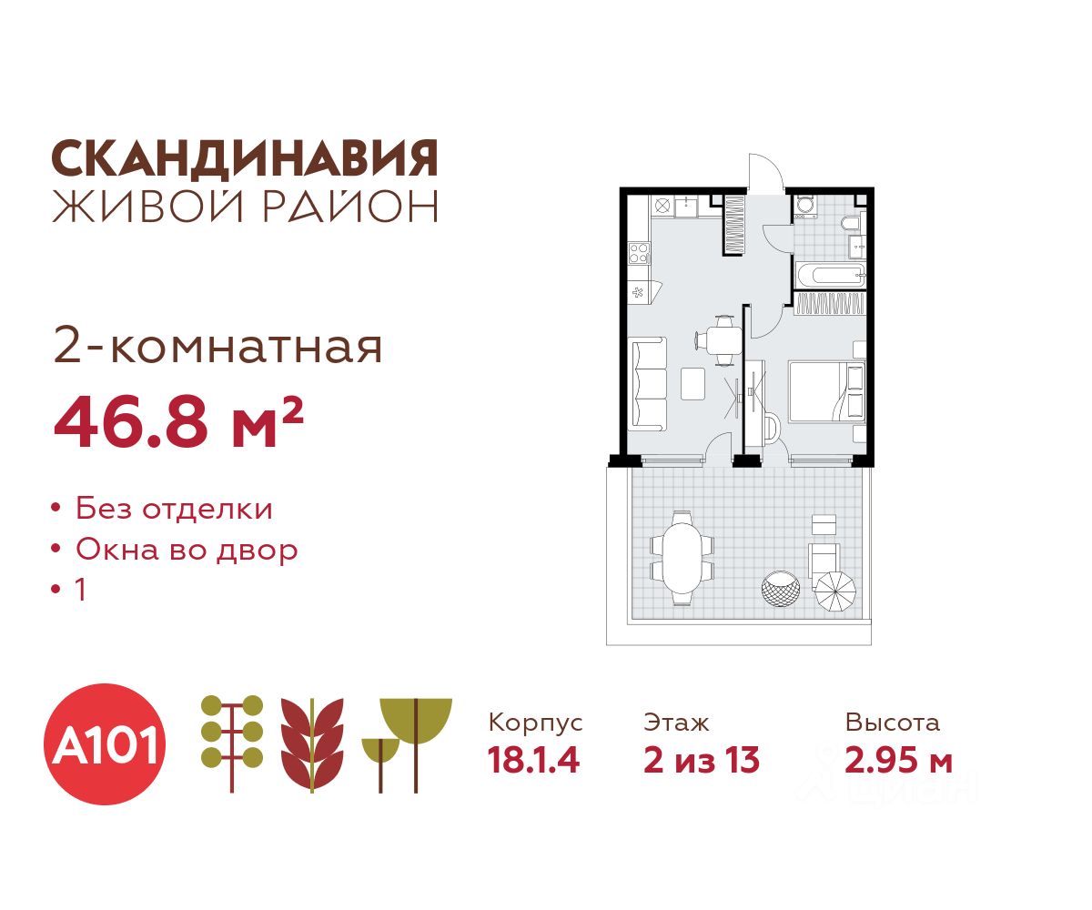 Продается двухкомнатная квартира 365 в новостройке Жилой район "Скандинавия" по адресу Москва, ТиНАО, Новомосковский АО, Коммунарка пос., жилой комплекс Скандинавия, 18.1.4, район Коммунарка, Новомосковский административный округ, Москва. Общая площадь квартиры - 46.80 кв. м., этаж 2 из 13, секция 4. Тип проекта, по которому построен дом - монолит, компания-застройщик - ООО "А101". Стоимость квартиры - 19857240 Р. Срок сдачи - 4 квартал 2026.