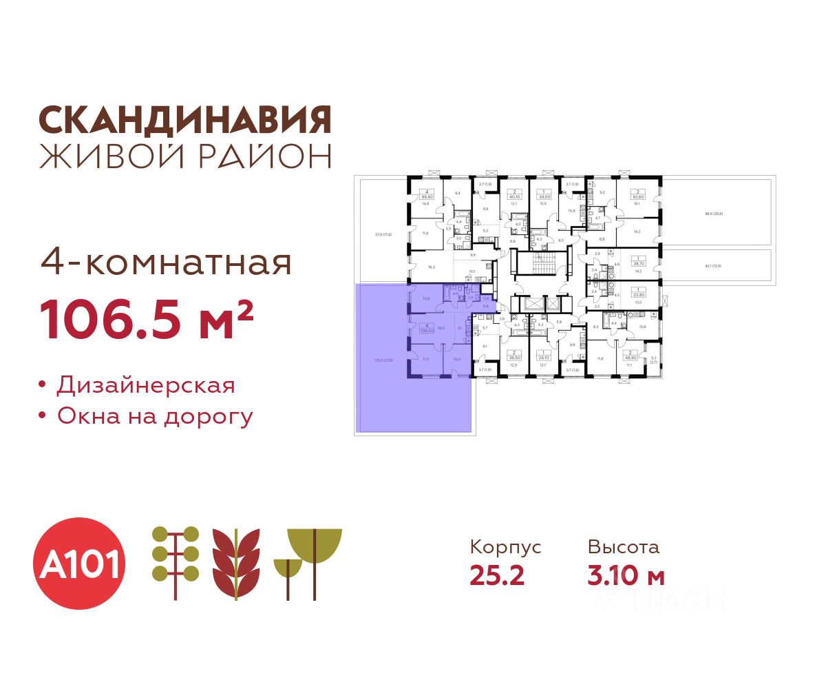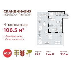 Продается четырехкомнатная квартира 151 в новостройке Жилой район "Скандинавия" по адресу Москва, ТиНАО, Новомосковский АО, Коммунарка пос., жилой комплекс Скандинавия, 25.2, район Коммунарка, Новомосковский административный округ, Москва. Общая площадь квартиры - 106.50 кв. м., этаж 2 из 17, секция 2. Тип проекта, по которому построен дом - монолит, компания-застройщик - ООО "А101". Стоимость квартиры - 34502630 Р. Срок сдачи - 2 квартал 2026.