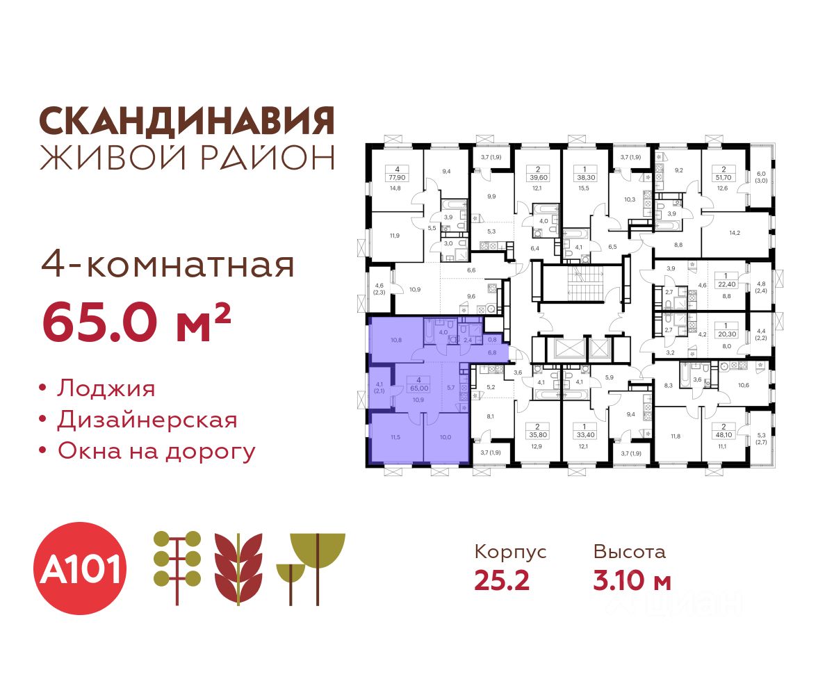 Продается четырехкомнатная квартира 301 в новостройке Жилой район "Скандинавия" по адресу Москва, ТиНАО, Новомосковский АО, Коммунарка пос., жилой комплекс Скандинавия, 25.2, район Коммунарка, Новомосковский административный округ, Москва. Общая площадь квартиры - 65.00 кв. м., этаж 17 из 17, секция 2. Тип проекта, по которому построен дом - монолит, компания-застройщик - ООО "А101". Стоимость квартиры - 31159700 Р. Срок сдачи - 2 квартал 2026.