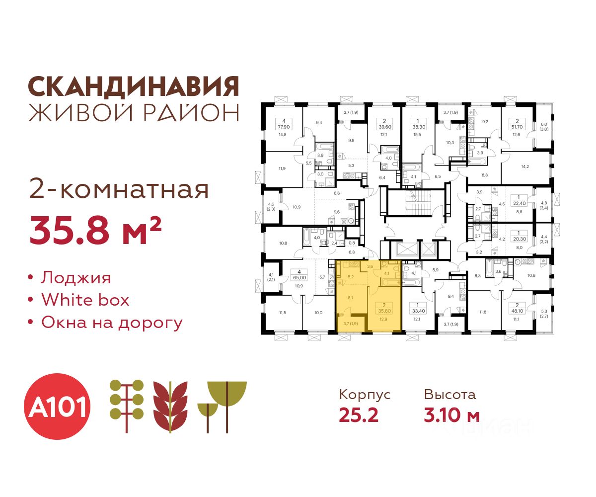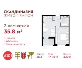 Продается двухкомнатная квартира 300 в новостройке Жилой район "Скандинавия" по адресу Москва, ТиНАО, Новомосковский АО, Коммунарка пос., жилой комплекс Скандинавия, 25.2, район Коммунарка, Новомосковский административный округ, Москва. Общая площадь квартиры - 35.80 кв. м., этаж 17 из 17, секция 2. Тип проекта, по которому построен дом - монолит, компания-застройщик - ООО "А101". Стоимость квартиры - 21957214 Р. Срок сдачи - 2 квартал 2026.