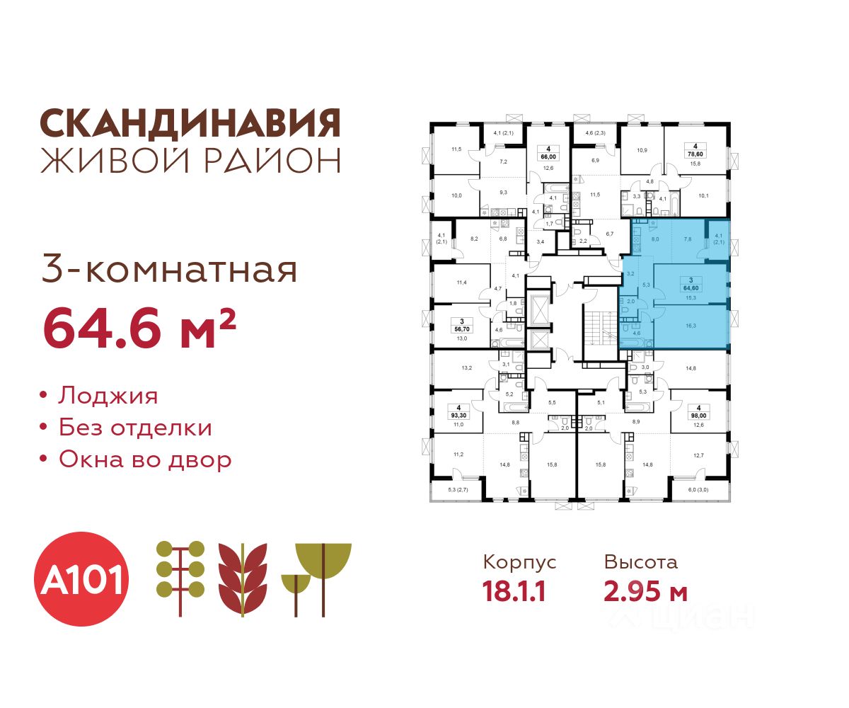 Продается трехкомнатная квартира 42 в новостройке Жилой район "Скандинавия" по адресу Москва, ТиНАО, Новомосковский АО, Коммунарка пос., жилой комплекс Скандинавия, 18.1.1, район Коммунарка, Новомосковский административный округ, Москва. Общая площадь квартиры - 64.60 кв. м., этаж 8 из 9, секция 1. Тип проекта, по которому построен дом - монолит, компания-застройщик - ООО "А101". Стоимость квартиры - 25071260 Р. Срок сдачи - 4 квартал 2026.