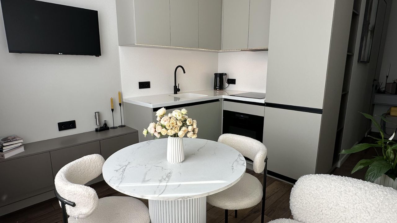 Просторная кухня-гостиная со стильным кухонным гарнитуром и всей необходимой встроенной техникой, мягкий, элегантный диван, обволакивает вас своей нежностью. Уютная, приватная спальня с комфортной кроватью с эргономичным матрасом, большим встроенным шкафом и зонированный освещением и вместительная гардеробная в прихожей оснащена системой хранения.
