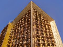 Здание состоит из двух объемов, один из которых сдвинут относительного другого в горизонтальной плоскости.