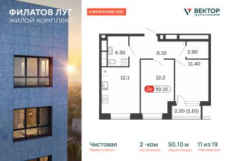 Продается 2-комн. квартира площадью 50,1 кв.м на 11 этаже 19 этажного дома в ЖК "Филатов Луг" от федерального девелопера ГК "Вектор".