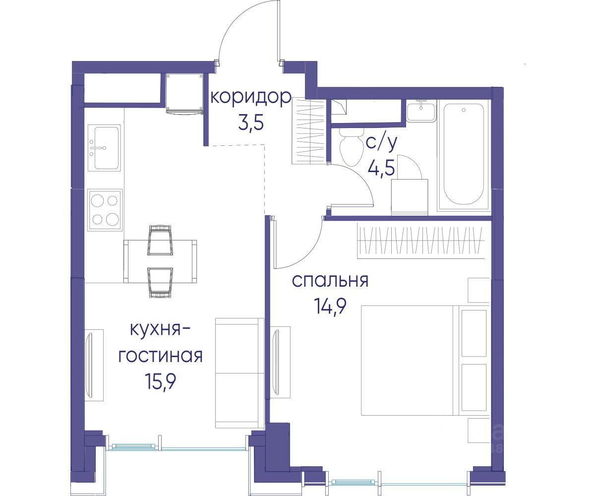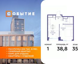 В продаже 1-к квартира от застройщика. Общая площадь 38.80, жилая 14.90, кухня 15.9. Квартира расположена на 35 этаже жилого квартала "Событие-6", корпус 2, 5. Квартира без отделки. Срок сдачи: 4 кв. 2029 года.