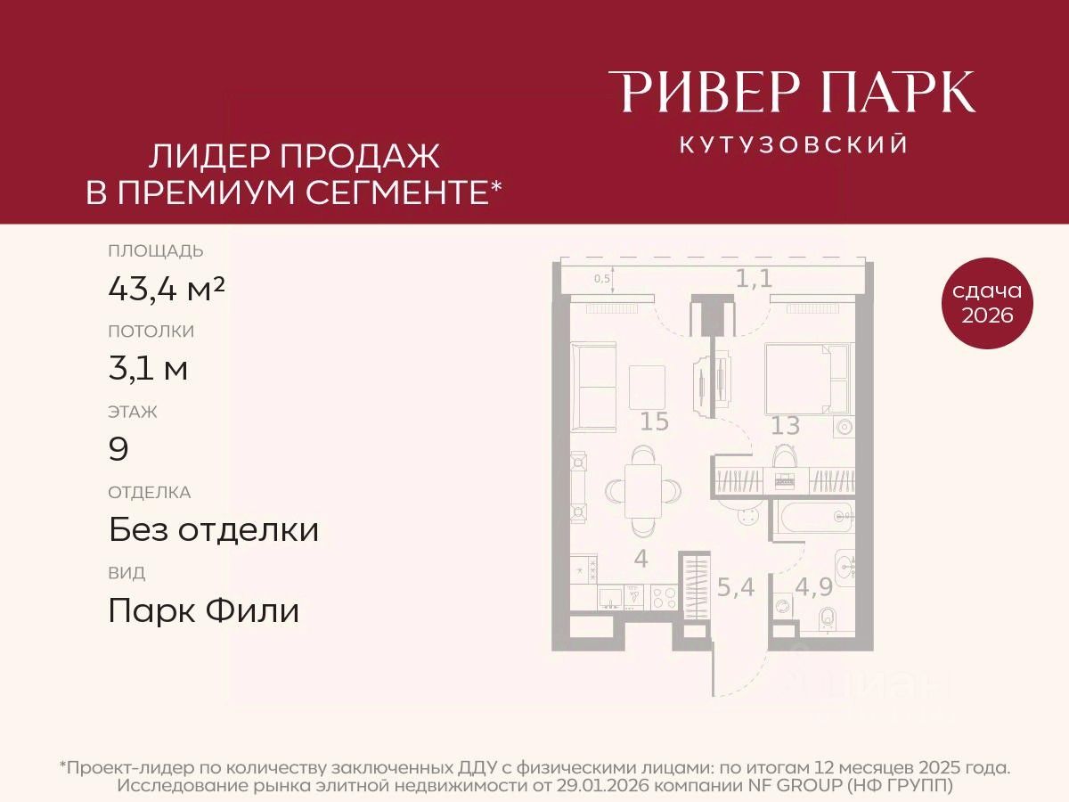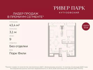 Продается 1-к квартира площадью 43.4 кв.м. на 9-м этаже в жилом комплексе премиум-класса Ривер Парк Кутузовский в Башне Янтарь