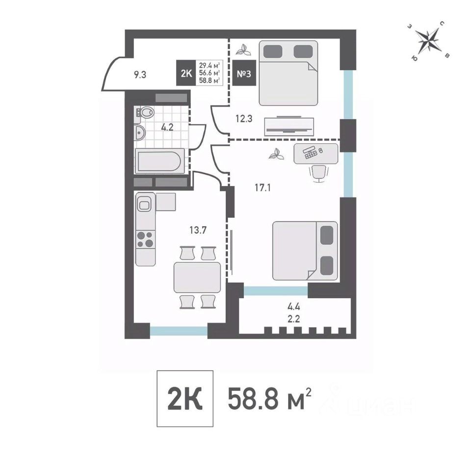 Продаётся 2-комнатная квартира в строящемся доме (Корпус 4), срок сдачи: IV-кв. 2026, общей площадью 58.8 кв.м., на 3 этаже. Жилой дом со встроенными нежилыми помещениями и подземной автостоянкой, расположенный по адресу: г. Москва, внутригородское муниципальное образование Матушкино, г. Зеленоград