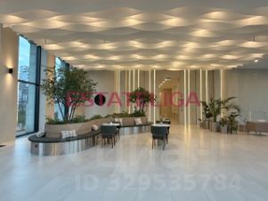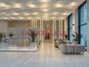 Парадный вход в дом — двухуровневый атриум с витражным остеклением и стеклянной крышей, высота потолков здесь превышает 6 метров. Интерьер лобби украшен живой зеленью, интерьерными бассейнами и каскадным водопадом. В зоне ресепшн с кофе-пойнтом — мягкие зоны ожидания с авторской мебелью. Для резидентов обустроены коворкинг, детский клуб, пространство для букшеринга, цифровые почтовые ящики и вендинговые аппараты.